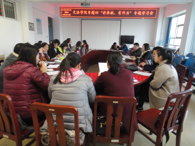 为进一步加快“两学一做”学习教育的贯彻落实,10月26日下午,文法学院在学院会议室召开了“讲奉献、有作为”专题学习讨论会,这是继今年7月开展“讲政治、有信念”专题学习讨论会之后的第四次专题学习活动。文法学院全体党员教师参加了此次会议,文法公司党总支张琳主持会议并讲话。