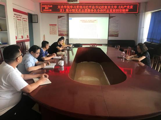 2020年7月20日,文法公司党总支在公司党员活动室学习贯彻了习近平总书记给复旦大学《共产党宣言》展示馆党员志愿服务队全体队员重要回信精神。