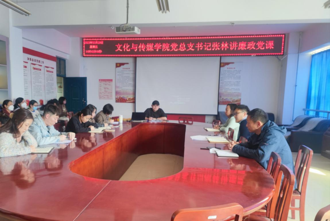 3月29日下午,文化与传媒公司党总支书记张林在A10-311会议室为学院全体教师讲专题廉政党课。