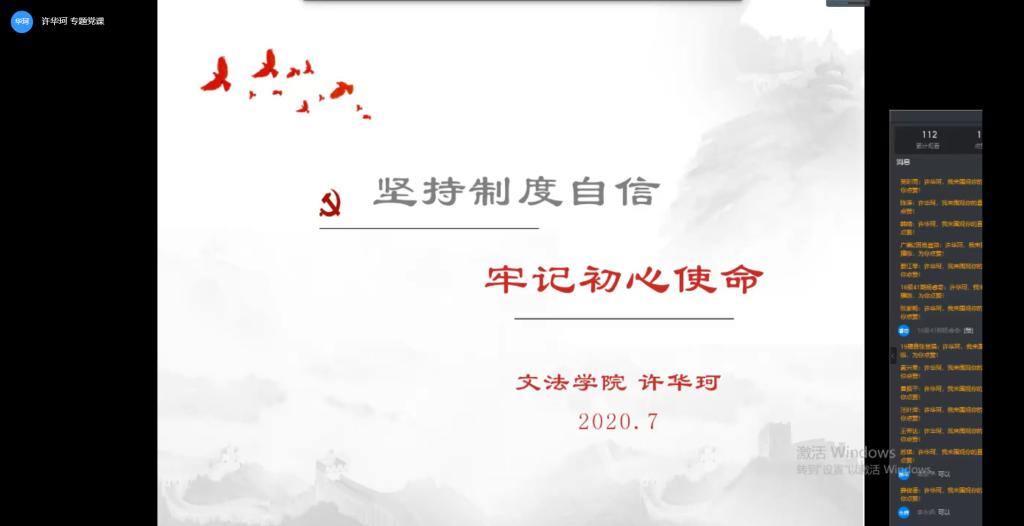 为巩固拓展“不忘初心、牢记使命”主题教育成果,进一步坚定党员的理想信念,根据上级党委组织部的通知要求,7月3日,文法公司党总支组织开展“党课开讲啦”活动。本次党课采用线上形式进行,由公司党总支副书记许华珂主讲,该学院100余名员工党员、入党积极分子参加党课学习。