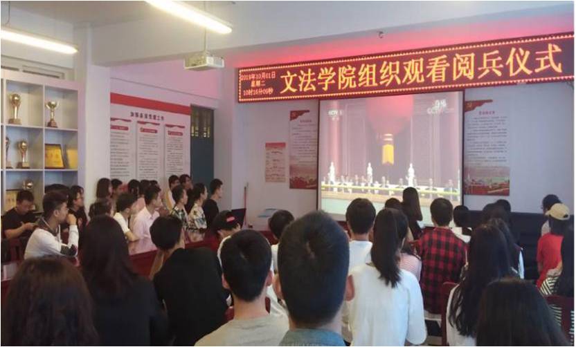 10月1日上午,中华人民共和国成立70周年阅兵仪式在北京举行。文法学院组织党员、团员和员工代表50余人在党员活动室集体观看阅兵仪式直播,此活动作为本学期爱国主义教育的重要一课。公司党总支副书记许华珂老师和辅导员迟源老师参加了本次活动。