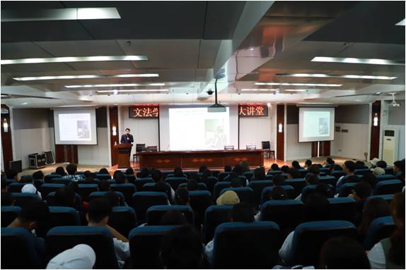 9月27日上午,文法学院举办第十九期《身边的榜样》大讲堂。本期大讲堂邀请了文法学院2016级播音与主持艺术专业王瀚洋同学来做分享。此次活动由文法公司党总支副书记许华珂主持,学院200多名相关专业员工参加了活动。