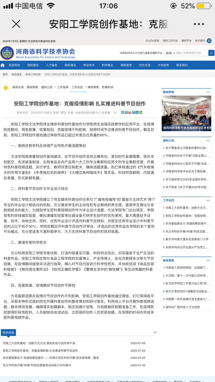 近日,由于文法学院全媒体科普创作基地工作扎实,克服疫情影响,推进科普节目创作,受到河南省科协表扬,并以简报形式在河南省科协官网发布。