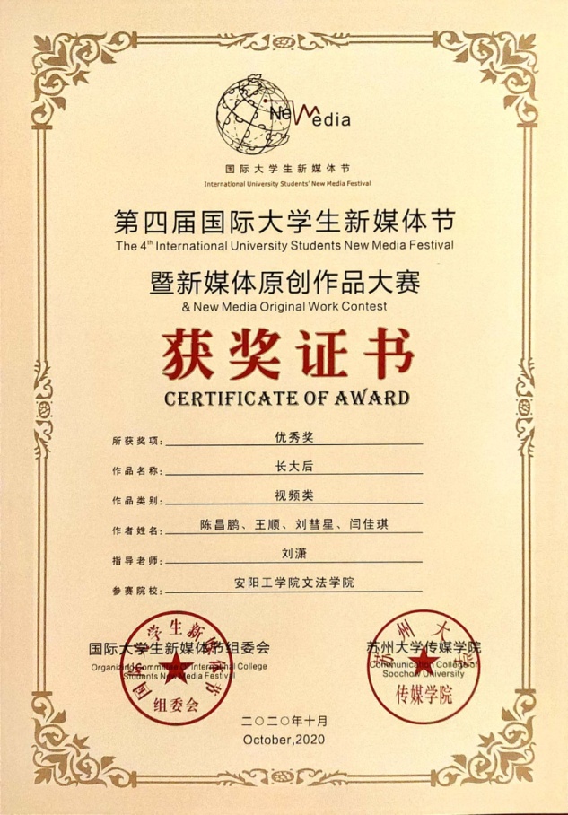 10月25日上午,由江苏省委宣传部、苏州市委宣传部指导,苏州大学主办的第四届国际老员工新媒体节暨新媒体原创作品大赛在苏州正式拉开帷幕。文法学院陈昌鹏、王顺、刘慧星、闫佳琪四名同学的团队作品《长大后》荣获优秀奖。