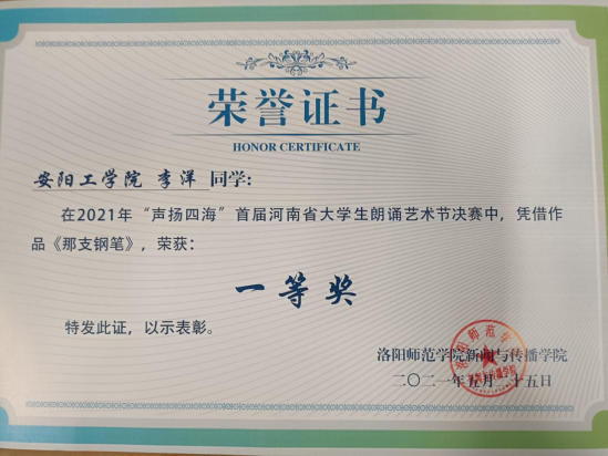 李洋同学的参赛作品为《那支钢笔》,由文化与传媒学院刘力豪老师进行培训、认真指导。比赛过程中,李洋同学积极备战,展现出优良的赛风赛纪,同时也做到了备战的长、精、细,在备战中不断升华自己的专业素养,在比赛中不断提升自己的专业技能,真正达到了“以赛促教,以赛促学,以赛促改”的效果。