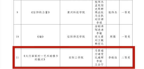 本次活动共收到61所高校报送的462部原创微电影、短视频作品。大赛组委会分别从中遴选出100部优秀作品。文化与传媒学院创作的微纪录片《太行画家村——艺术助推乡村振兴》荣获二等奖;微纪录片《扁担精神肩上挑 乡村振兴路上跑》荣获三等奖;微电影《那人 那山 那渠》荣获优秀奖。