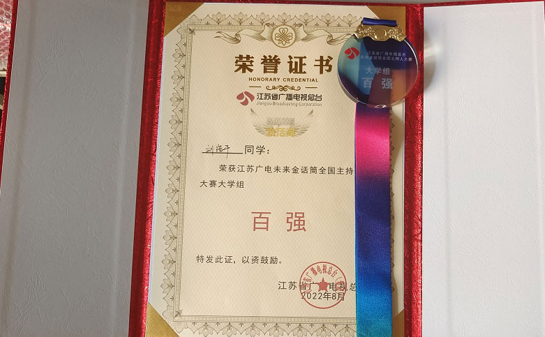 2022年8月,第九届江苏广电“未来金话筒”全国主持人大赛决赛落下帷幕,该赛事覆盖全国四百多所高校,本届大赛由来自全国各地的超过4100名选手参与。文化与传媒学院播音与主持艺术专业刘浩千同学在决赛中取得全国百强的好成绩。