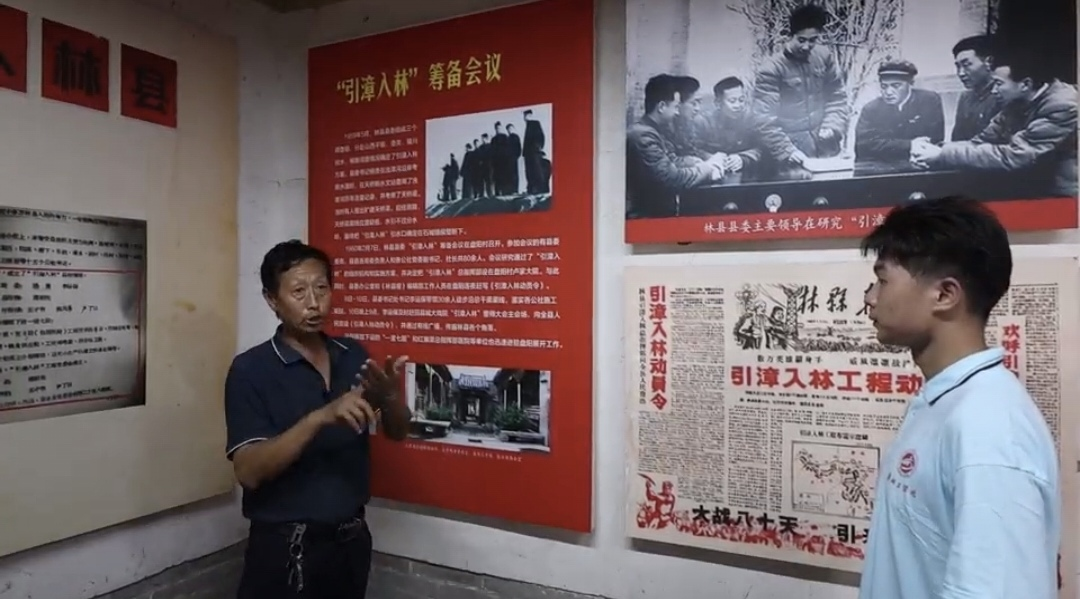 演出结束后,同学们在纪念馆内跟随讲解员的步伐,切身感受红旗渠建设的艰辛和成就。一张张真实的照片、一个个逼真的沙盘模型,以及当年修渠工人们使用过的提灯、垫肩、棉袄等实物,全面回顾和展示了红旗渠精神的孕育、形成和发展过程。同学们被这些珍贵的展品深深吸引,纷纷驻足观看,在沉浸式学习中加深对红旗渠精神内涵的理解。随后,团队成员们又来到了红旗渠总干渠和青年洞。他们沿着蜿蜒曲折的红旗渠,徒步前行,亲身体验了当年修渠人的艰辛与不易。在青年洞前,他们驻足凝视,被这个由300名优秀青年在最困难的时候凿通的隧洞所震撼,并再次深情朗诵《红旗渠》。活动中,同学们扛起相机拿起话筒,随机采访了观看展演和纪念馆的游客,倾听他们的对红旗渠精神的理解和感受,加深了同学们对红旗渠精神的理解和学习。