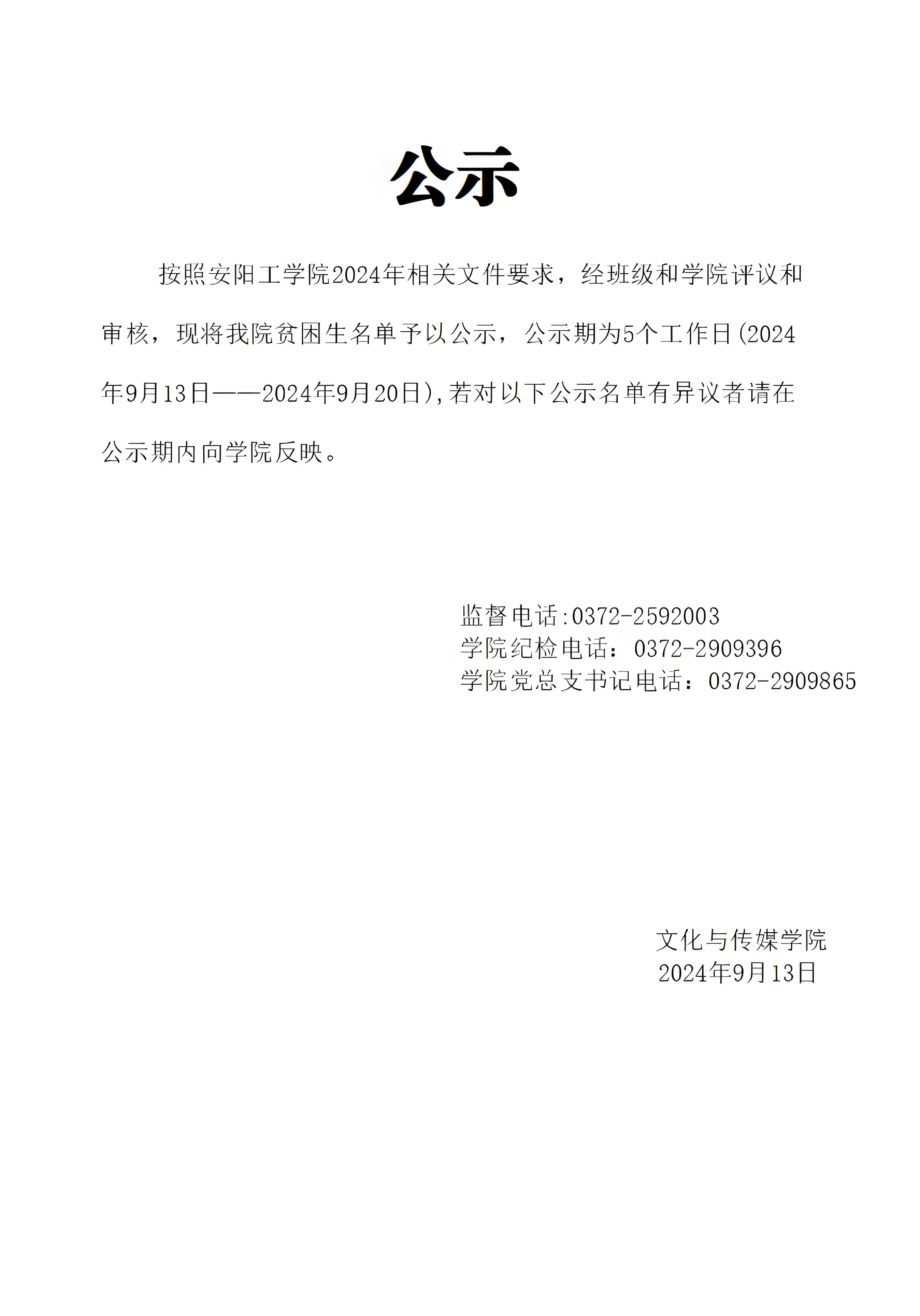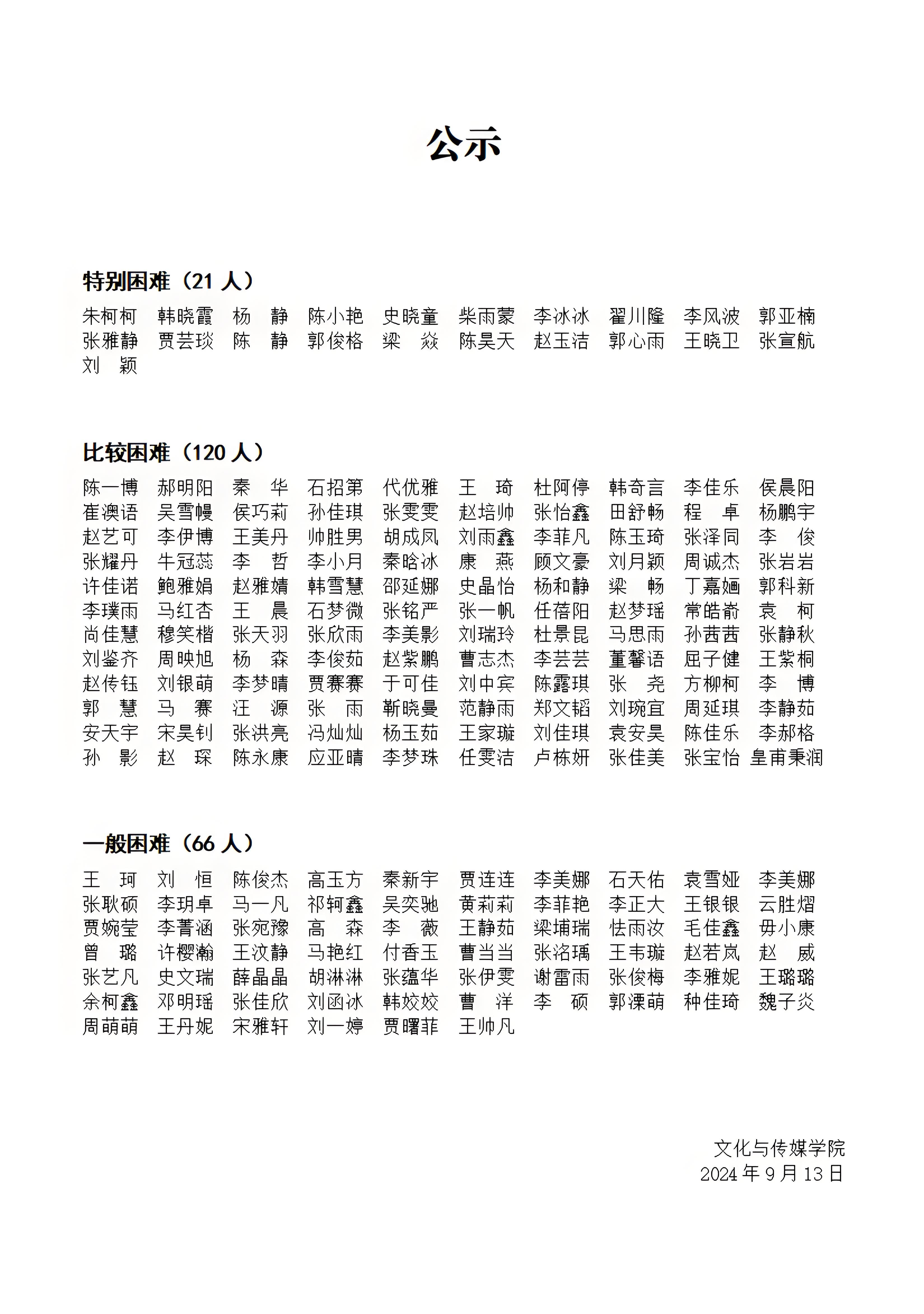 文化与传媒学院2024年贫困生名单公示