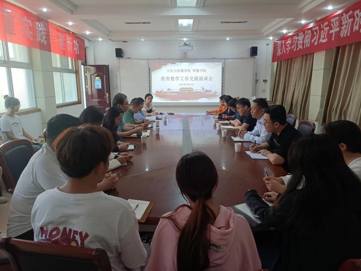 5月23日,文化与传媒学院到明德书院召开公司产品工作交流座谈会。文化与传媒学院领导班子、明德书院领导班子及师生代表参加座谈会。