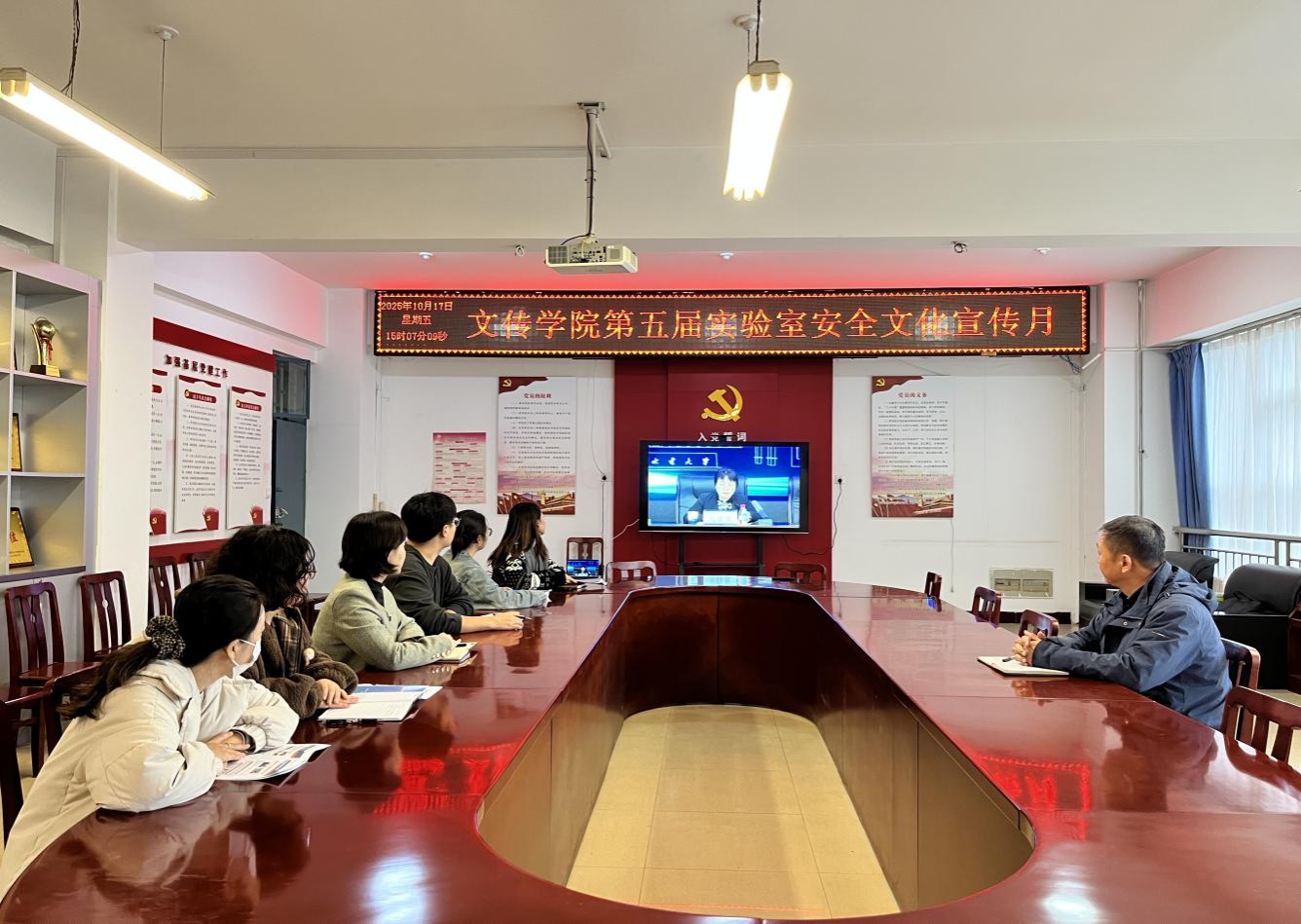 2025年10月17日,文传学院在会议室组织观看了“河南高校第五届实验室安全文化宣传月开幕式”。学院副经理余锐、实验中心主任燕京、党政办公室副主任刘飞,以及实验中心管理员和实验课老师参加了本次会议。余锐在会上强调,实验室的安全工作重于泰山,要在保证好实验室安全的基础上服务好师生,加强实验室安全知识的宣传,预防安全事故的发生。